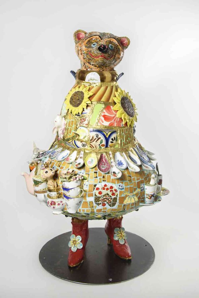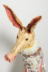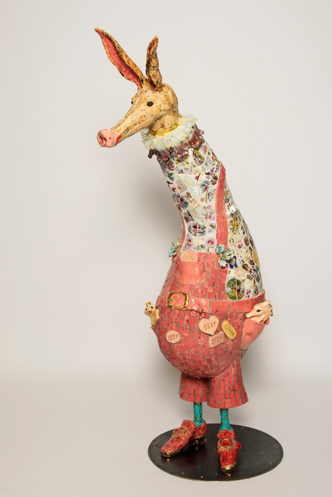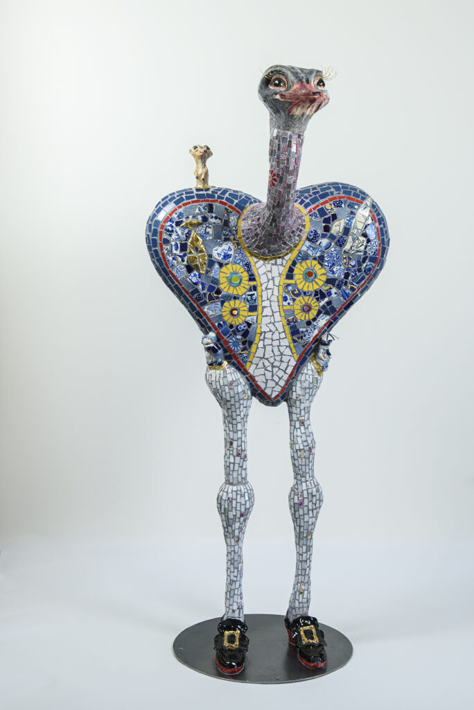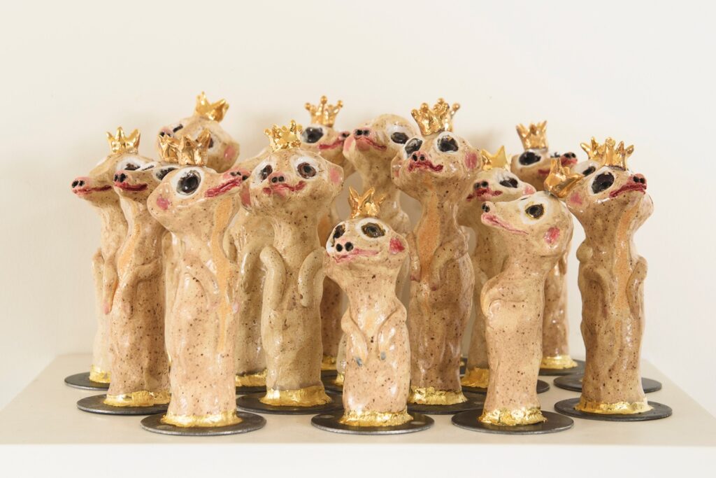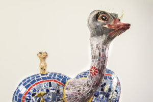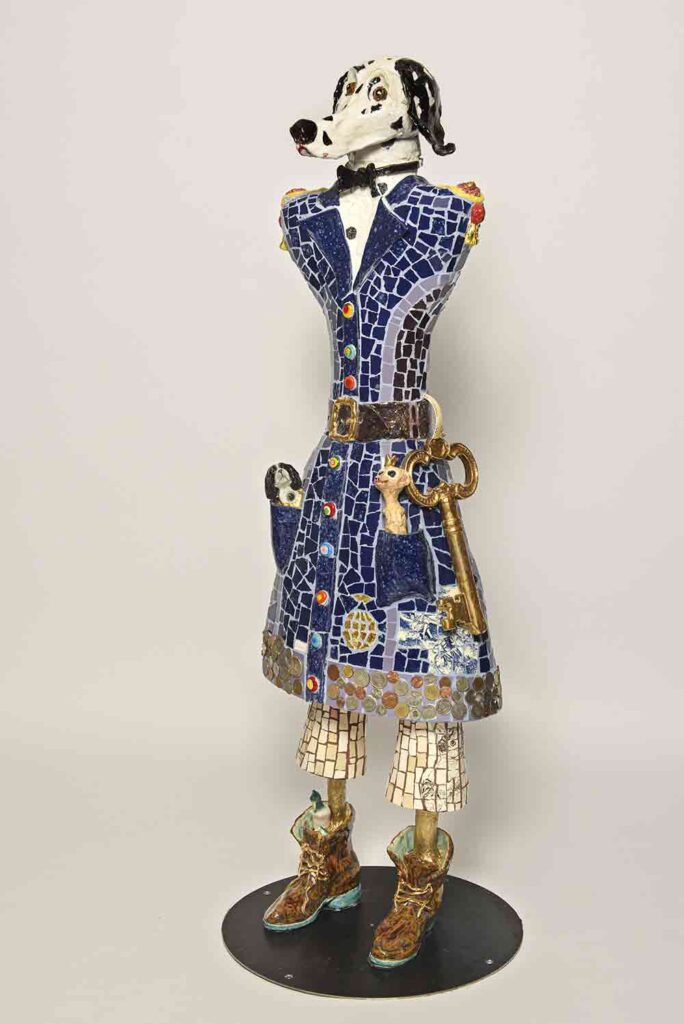 Van links naar rechts stellen wij u graag voor aan Marie Chanel als steengoedmeester van de haute couture (paradijsvogel), Samuel Savon als steengoedmeester van de geurzaken (aardvarken), Ali Goedhard als steengoedmeester van de waardezaken (dalmatiër) en Jasmina Smickels als steengoedmeester van de keuken en bloemenzaken (beer). De twee lakeien en de familie stokstaartje.Â